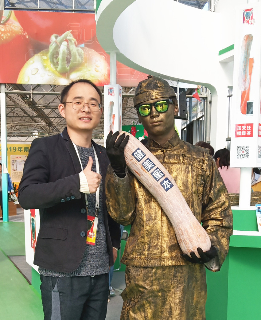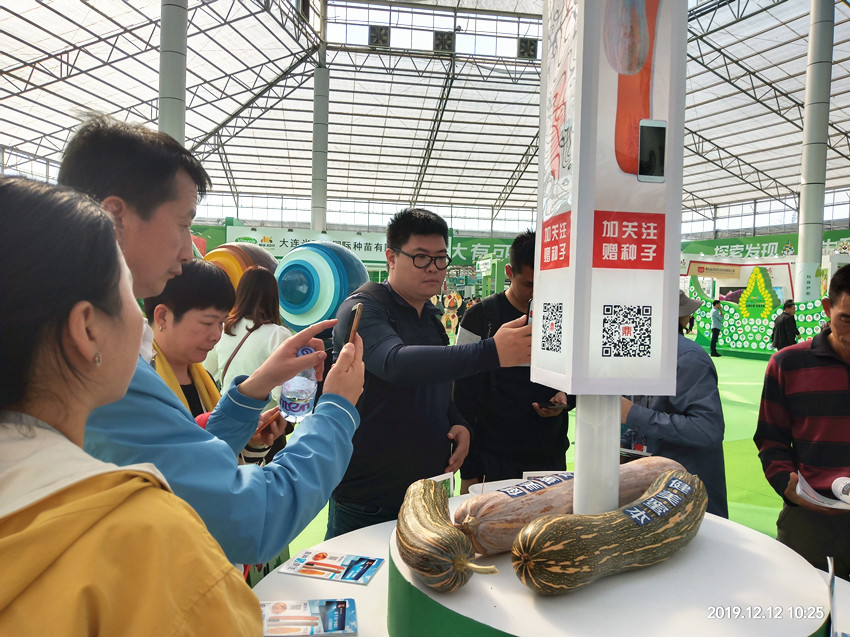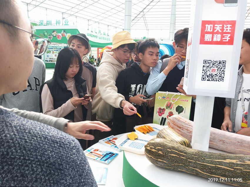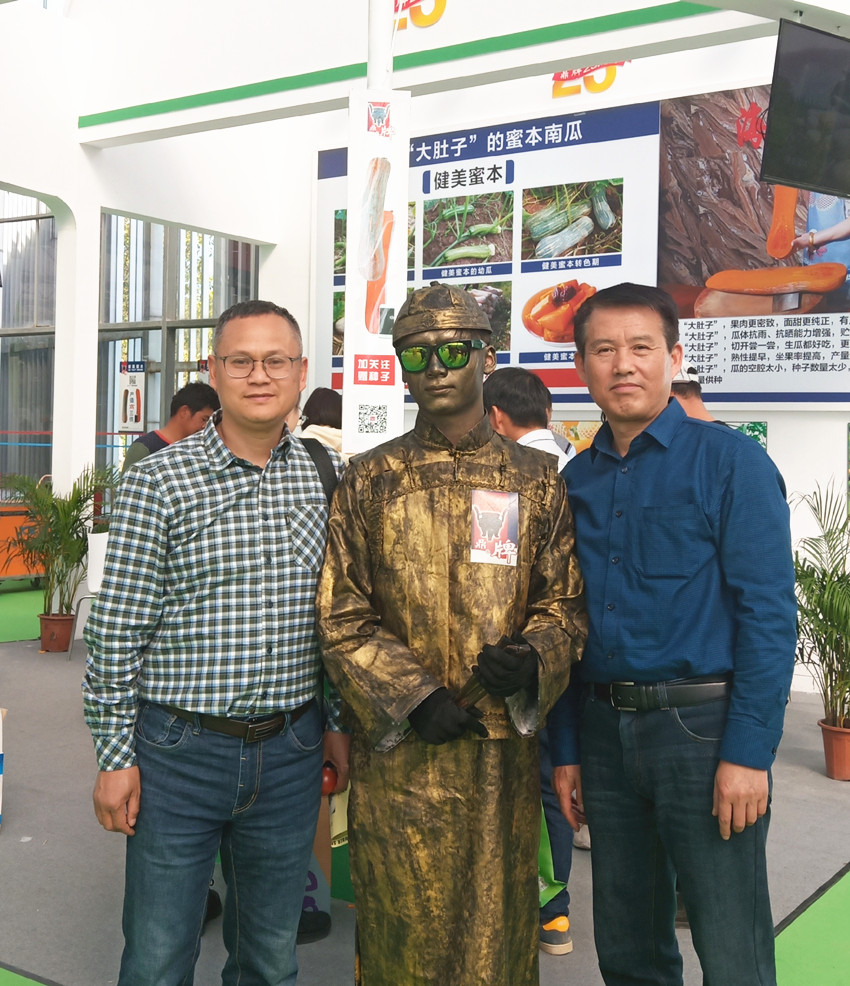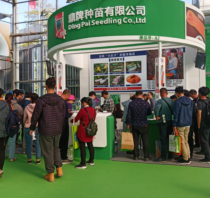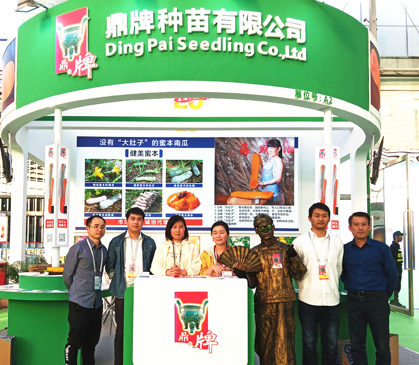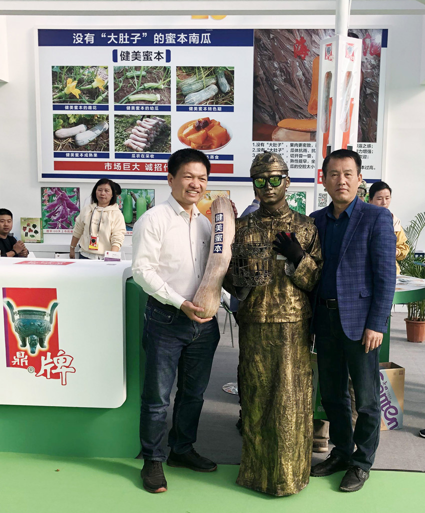 活動現(xiàn)場,鼎牌展位(A2)在展示大廳脫穎而出。客商們走到展臺前紛紛停下腳步,被鼎牌獨(dú)創(chuàng)的“沒有大肚子的健美蜜本南瓜”所吸引。